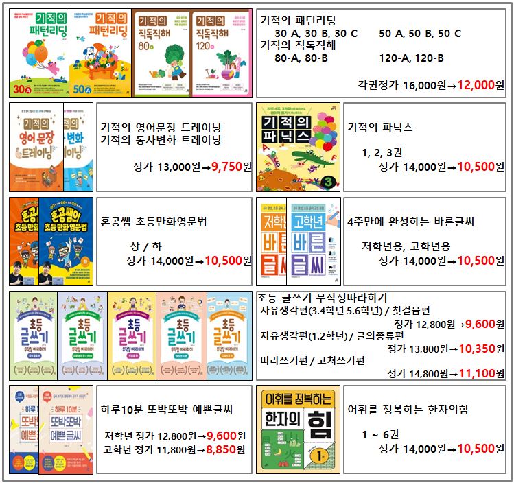 ■ 길벗스쿨 - 기적의영어일기, 기적의계산법, 기적의독서논술, 기적의수학문장제, 기적의독해력, 기적의한글학습, 기적의역사논술, 기적의영어문장만들기, 기적의사이트워드, 기적의맞춤법띄어쓰기, 기적의패턴리딩, 기적의직독직해, 기적의영어문장트레이닝, 기적의동사변화트레이닝, 기적의파닉스, 혼공쌘만화영문법, 4주만에완성하는바른글씨, 초등글쓰기무작정따라하기, 어휘를적복하는한자의힘 등등등
