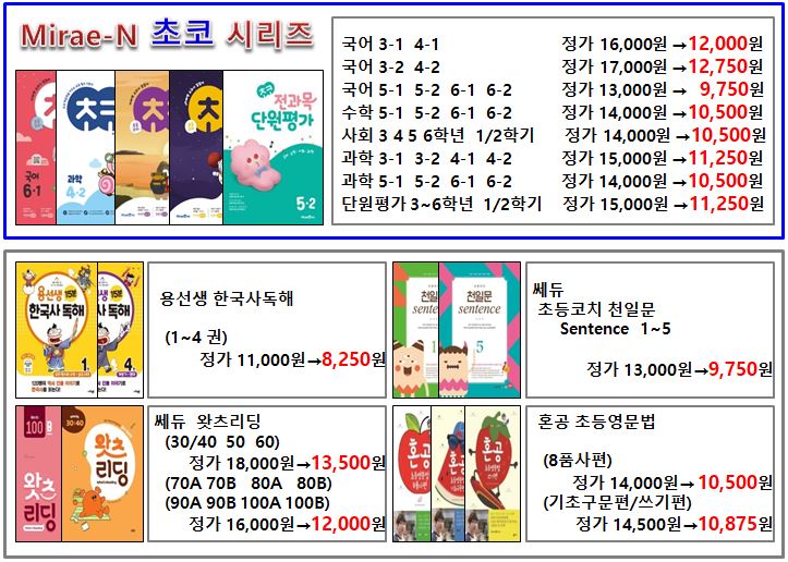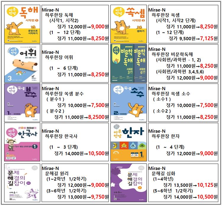 ■ 미래엔 - 하루한장독해, 하루한장쏙셈, 하루한장어휘, 하루한장비문학독해, 하루한장한국사, 하루한장한자, 문제해결의길잡이(문해길), 초코