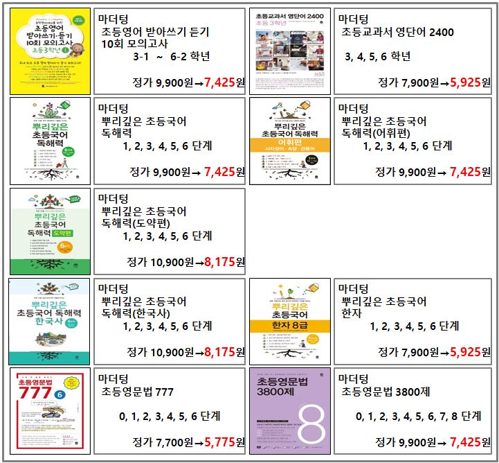 ■ 마더텅 - 초등영어받아쓰기듣기모의고사, 초등교과서영단어2400, 뿌리깊은초등국어독해력, 뿌리깊은초등국어독해력(어휘편), 뿌리깊은초등국어독해력(도약편), 뿌리깊은초등국어독해력(한국사), 뿌리깊은초등국어한자, 초등영문법777, 초등영문법3800제